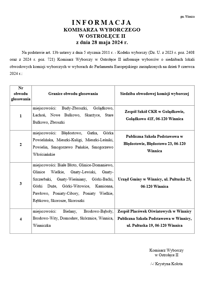 gm. Winnica I N F O R M A C J A KOMISARZA WYBORCZEGO W OSTROŁĘCE II z dnia 28 maja 2024 r.