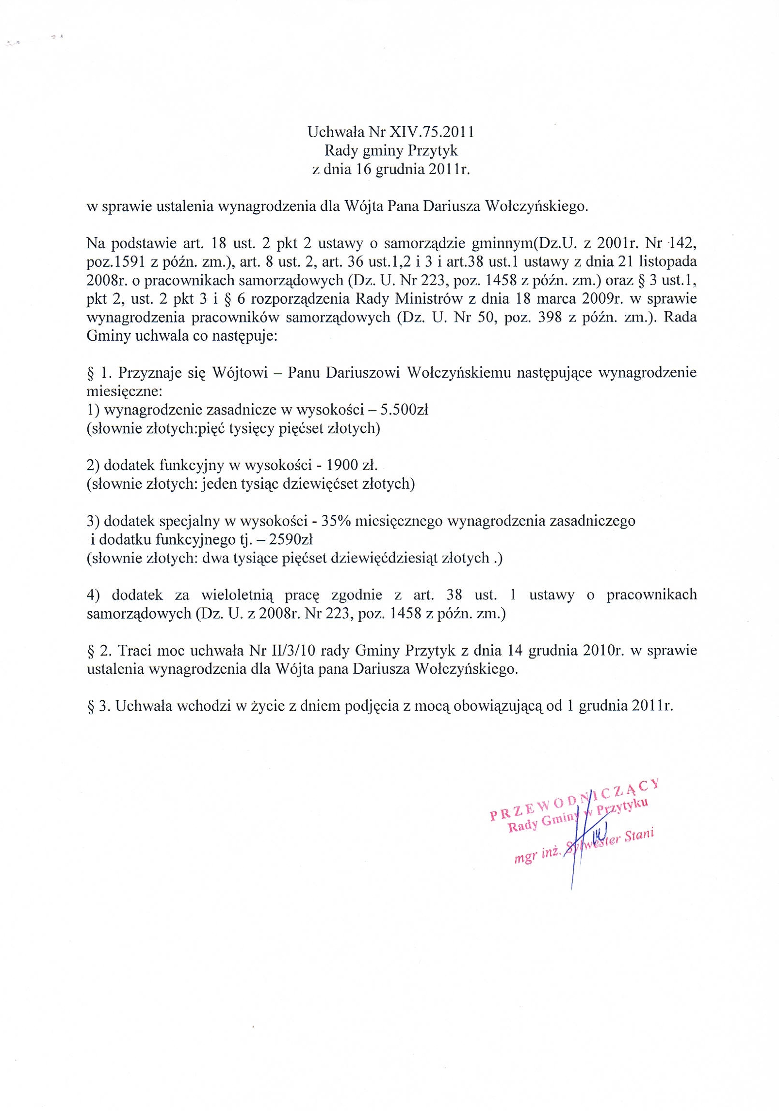 Uzasadnienie do uchwały Nr XV.75.2011 w spr. ustalenia wynagrodzenia dla Wójta Pana Dariusza Wołczyńkiego |