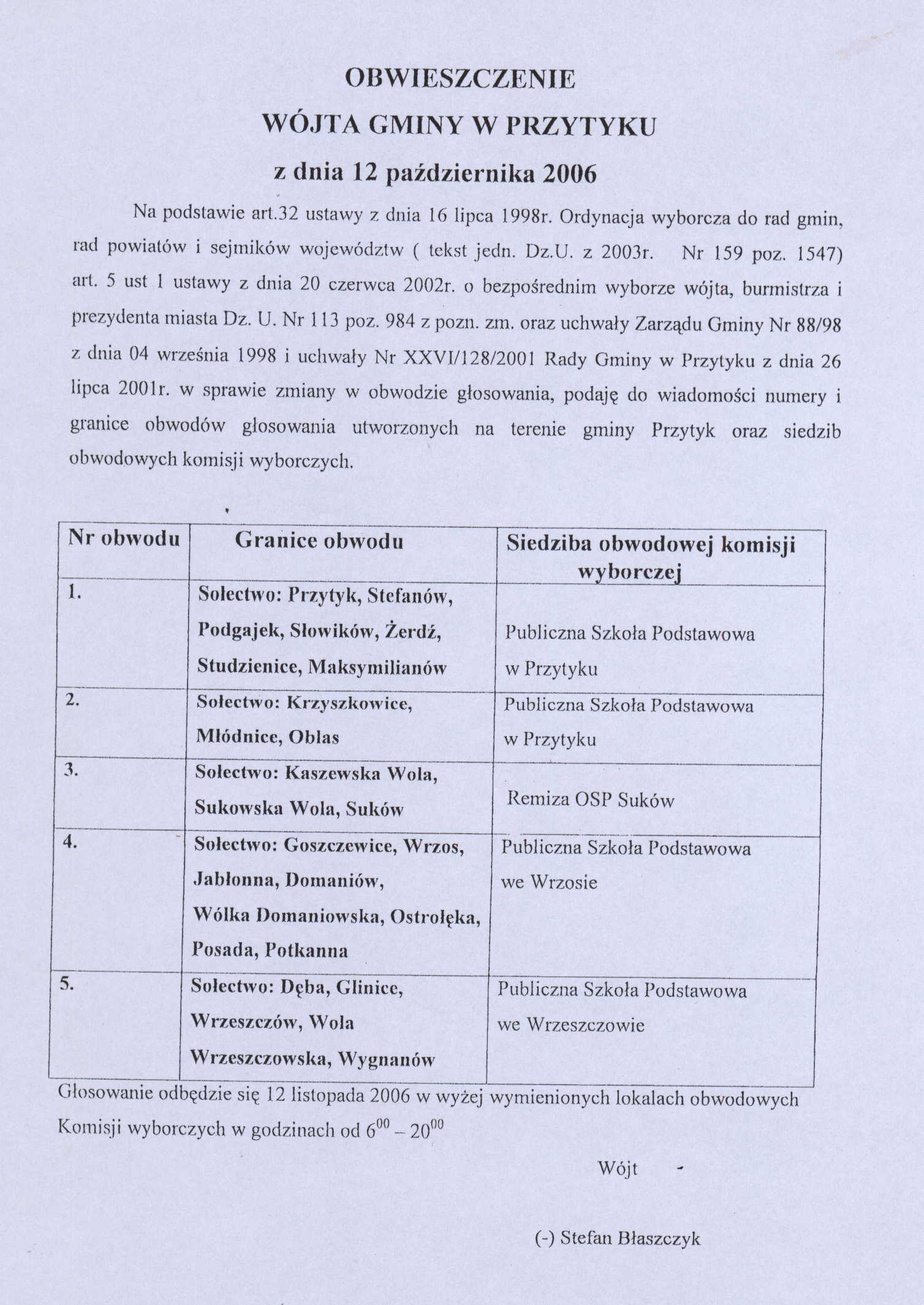 | Obwieszczenie Wójta Gminy w Przytyku z dnia 12.10.2006r |