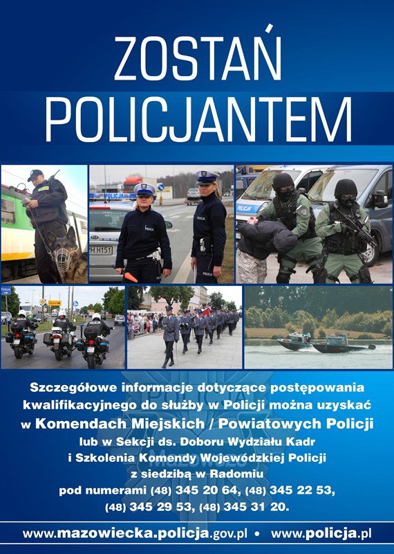 Komendant Wojewódzki Policji z siedzibą w Radomiu ogłasza rozpoczęcie procedury doboru kandydatów do służby w Policji w 2023 roku na terenie województwa mazowieckiego. Poniżej znajdziesz niezbędne informację dotyczące procedury naboru. Służba w Policji cieszy się coraz większym zainteresowaniem nie tylko w kwestii stabilizacji zatrudnienia, ale również jako praca dająca szanse rozwoju i awansu. Zachęcamy do wstąpienia w nasze szeregi.