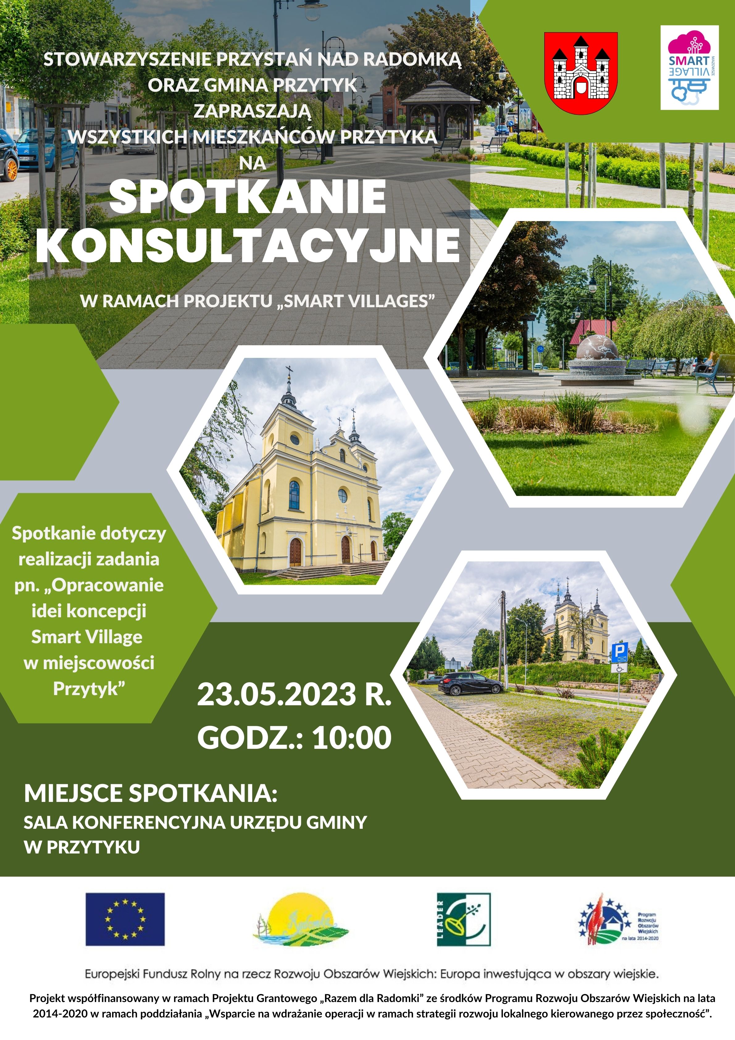 Stowarzyszenie Przystań nad Radomką oraz Gmina Przytyk zaprasza wszystkich mieszkańców Przytyka i okolic na spotkanie konsultacyjne w ramach projektu „Smart villages” dotyczące realizacji zadania pn. „Opracowanie idei koncepcji Smart Village w miejscowości Przytyk”. Spotkanie odbędzie się we wtorek 23 maja o godzinie 10:00 w sali konferencyjnej Urzędu Gminy w Przytyku.