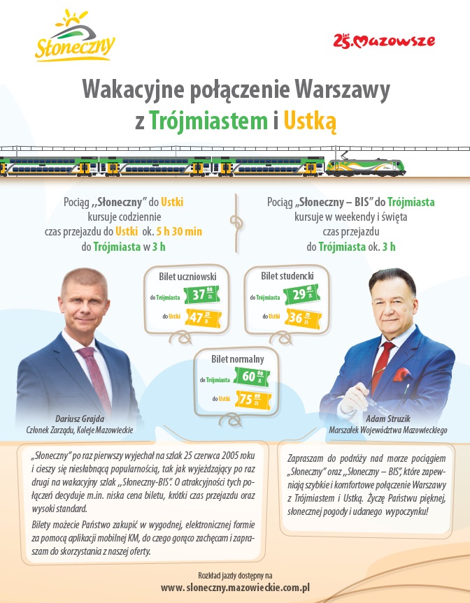 Spółka „Koleje Mazowieckie – KM” 24 czerwca 2023 r. uruchomi wakacyjne połączenie Warszawy z Trójmiastem i Ustką – pociąg „Słoneczny”, dodatkowo tak jak w poprzednim roku uruchomione zostanie połączenie w soboty, niedziele i święta - „Słoneczny – BIS”, które umożliwi podróżnym dojazd do Trójmiasta.