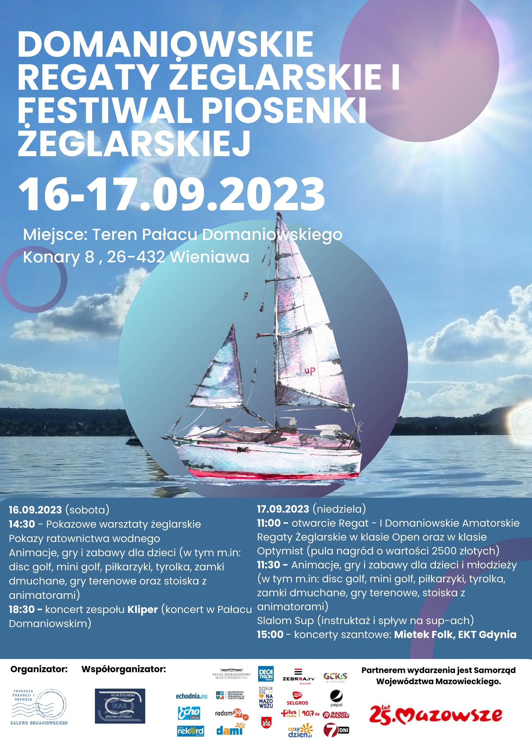 W sobotę 16 września od godziny 14.30 prowadzone będą otwarte warsztaty żeglarskie, którym towarzyszyć będą pokazy ratownictwa wodnego, rodzinne gry plenerowe, atrakcje dla dzieci (dmuchańce, tyrolka, disc golf, piłkarzyki, minigolf) oraz animacje i warsztaty artystyczne. Pierwszy dzień zwieńczy koncert radomskiego zespołu szantowego Kliper, który odbędzie się o godzinie 18.30 w Pałacu Domaniowskim.