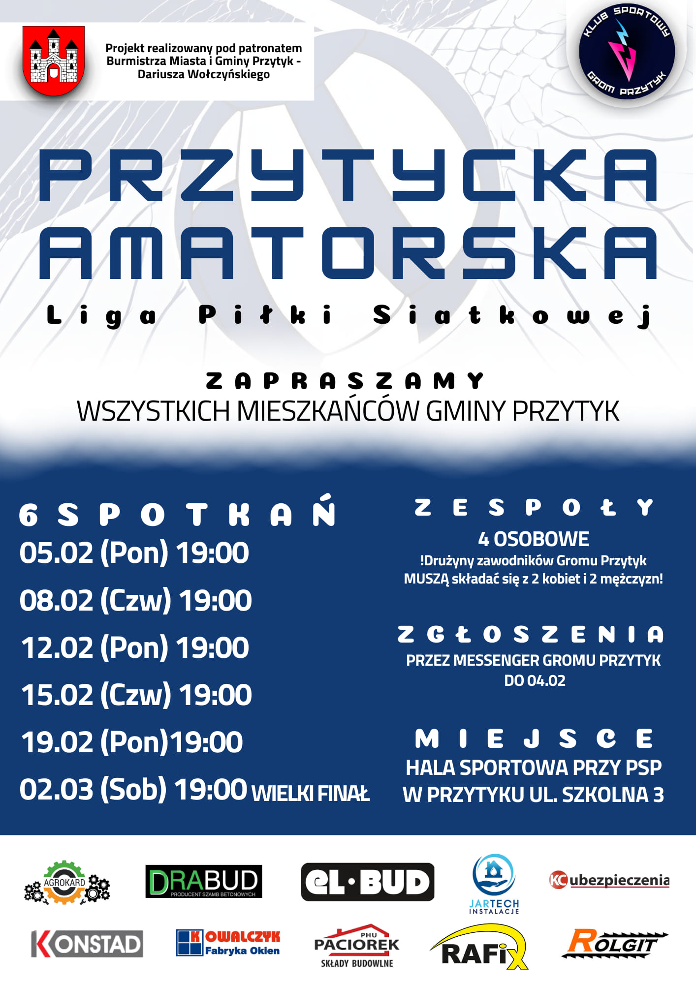 Urząd Miejski w Przytyku oraz Klub Sportowy Grom Przytyk zaprasza mieszkańców gminy Przytyk do udziału w Przytyckiej Amatorskiej Lidze Piłki Siatkowej.