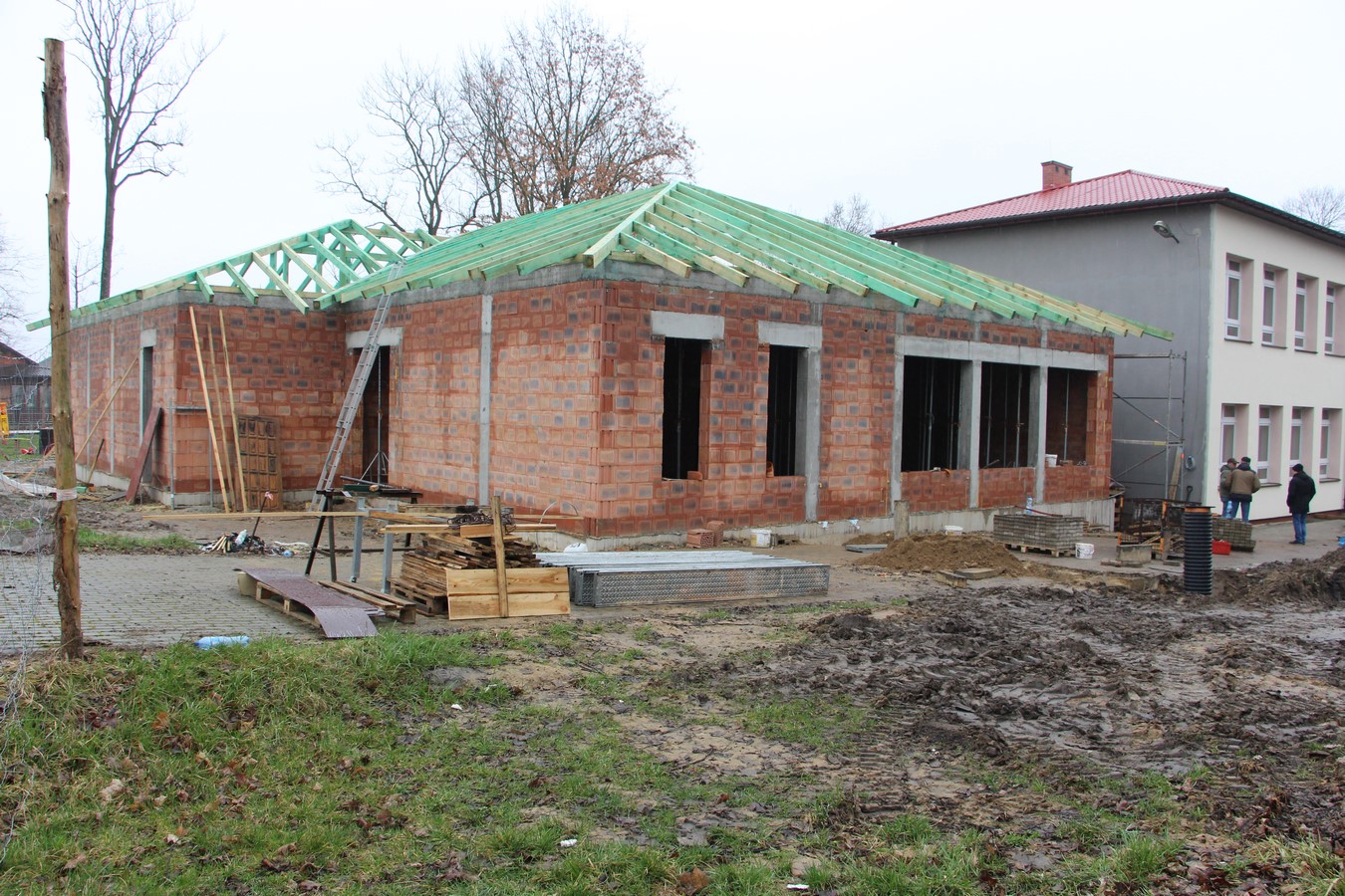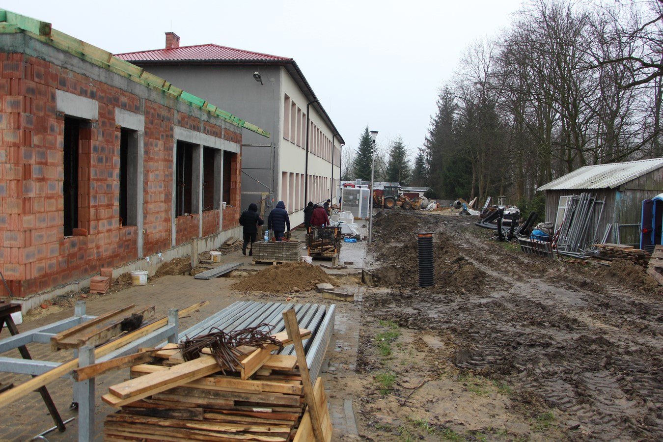 Na terenie budowy pojawił się także nowy budynek wzniesiony w stanie surowym, obejmując fundamenty, ściany konstrukcyjne, warstwy pod posadzkowe, a także strop monolityczny wylewany z betonu oraz konstrukcję więźby dachowej. Nie zapomniano również o niezbędnych instalacjach, takich jak wodociągowa, kanalizacja sanitarna, instalacje centralnego ogrzewania oraz pompy ciepła.