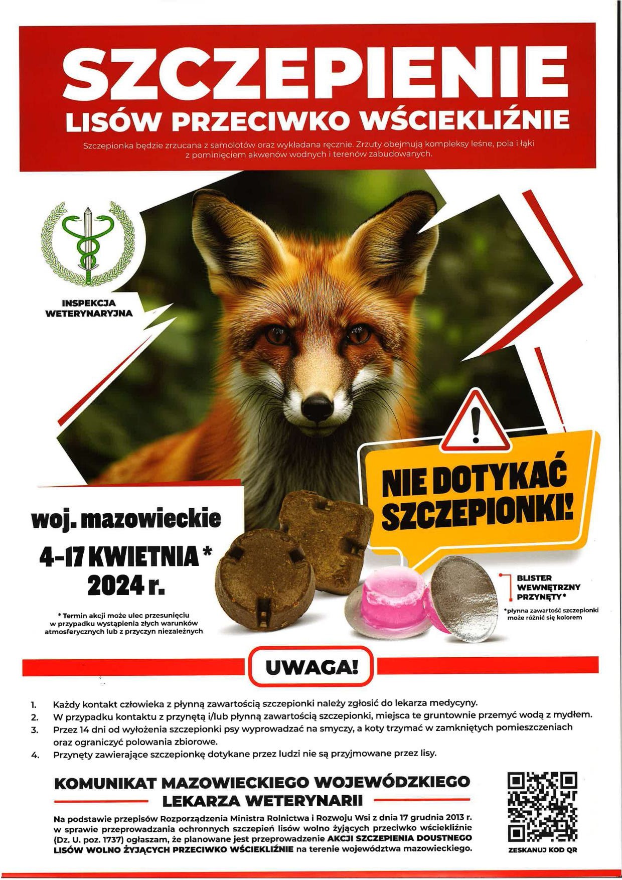 , że w dniach 04-17 kwietnia na terenie powiatu radomskiego przeprowadzona zostanie akcja szczepienia lisów wolno żyjących przeciwko wściekliźnie w formie zrzutów lotniczych. W związku z powyższym wszystkich mieszkańców Gminy Przytyk prosimy o zastosowanie się do wytycznych określonych w zamieszczonych poniżej materiałach informacyjnych.