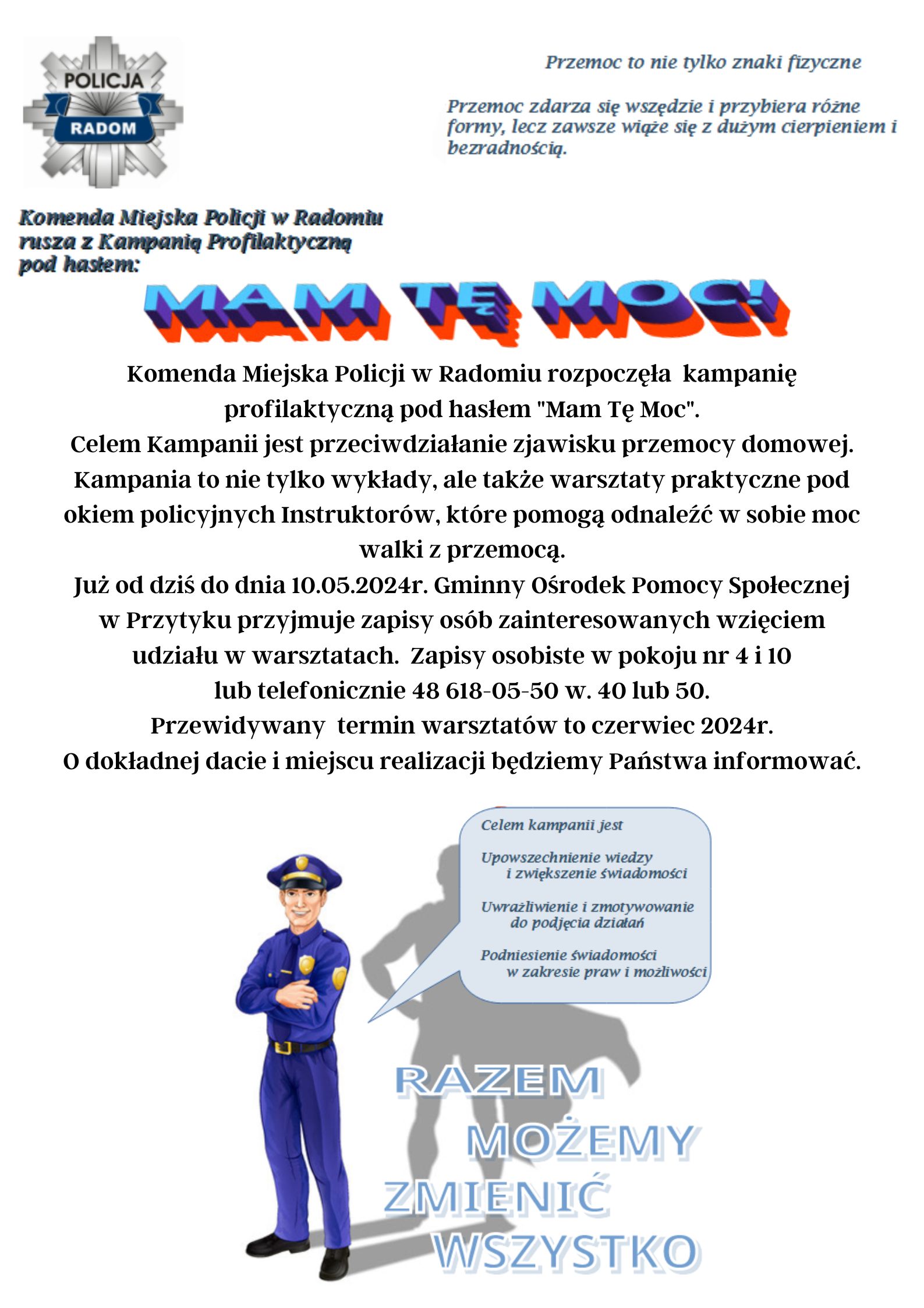 W kwietniu 2024 roku funkcjonariusze Komendy Miejskiej Policji w Radomiu rozpoczynają kampanię pod hasłem "Mam Tę Moc". Celem kampanii jest zwiększenie wiedzy mieszkańców powiatu radomskiego na sytuacje doznawania przemocy domowej przez osoby zależne i przeciwdziałanie zjawisku przemocy domowej. Na terenie powiatu radomskiego organizowane będą warsztaty w ramach kampanii, podczas których funkcjonariusze Policji przeprowadzą prelekcje na temat przemocy, opowiedzą o Procedurze Niebieskiej Karty, a także będą mieli możliwość wzięcia udziału w zajęciach praktycznych pod okiem policyjnego Instruktora Technik i Taktyki Interwencji. Harmonogram spotkań już niebawem.