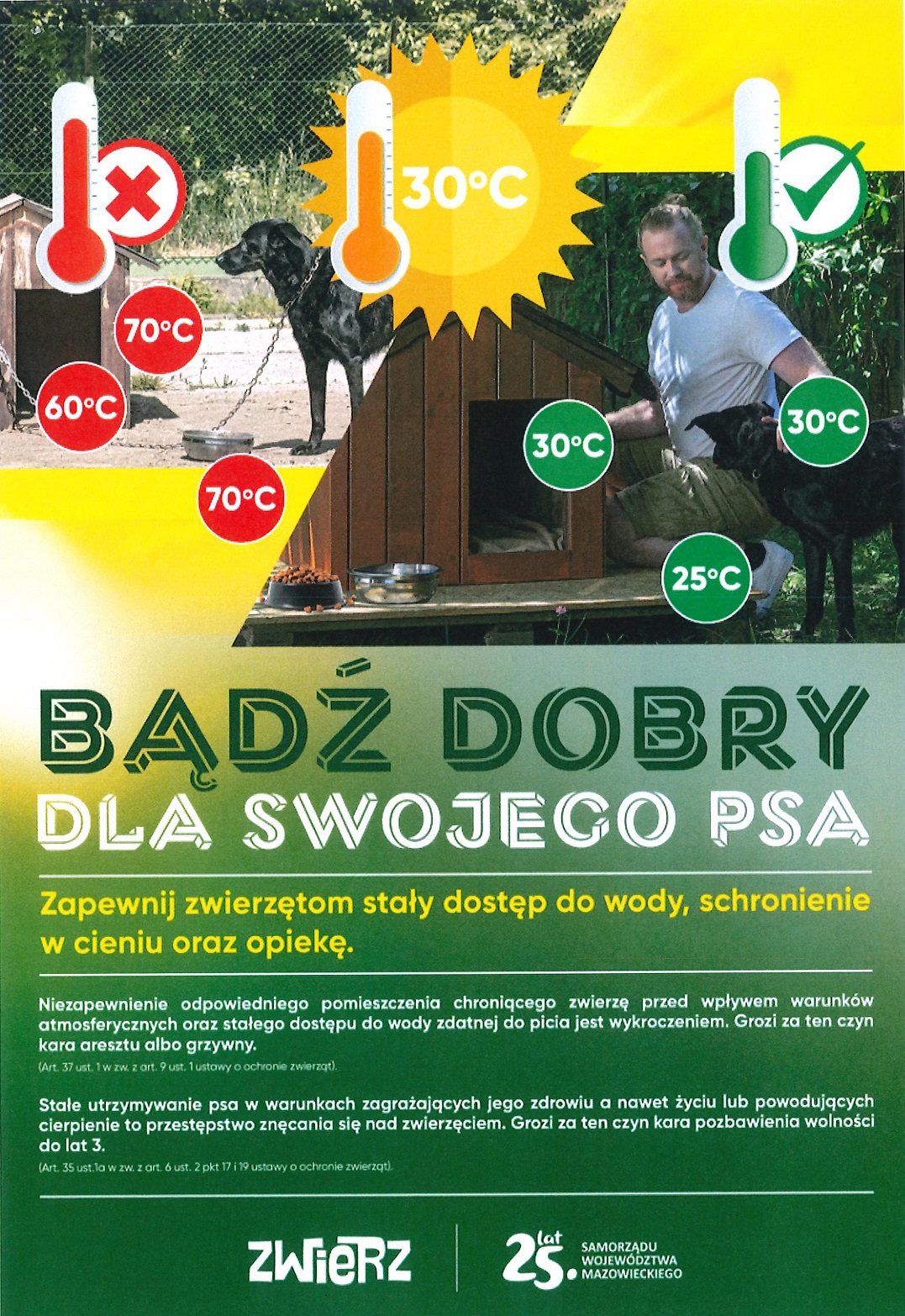Niezapewnienie odpowiedniego pomieszczenia chroniącego psa przed upałami oraz stałego dostępu do wody zdatnej do picia jest wykroczeniem. Grozi za ten czyn kara aresztu albo grzywny (art. 37 ust. 1 w zw. z art. 9 ust. 1 ustawy o ochronie zwierząt).