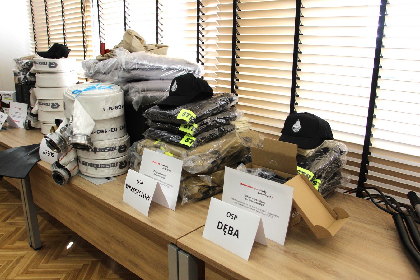 Do druhen i druhów z siedmiu jednostek OSP w naszej gminie trafił specjalistyczny sprzęt i środki ochrony indywidualnej niezbędne do codziennej pracy. Strażacy otrzymali węże tłoczone, tłumice gumowe z drążkami teleskopowymi, wodery, pasy bojowe, linki strażackie, widły do siana, piły spalinowe, piły teleskopowe, podkrzesywarkę spalinową, latarki kątowe, przedłużacze elektryczne, hydronetki plecakowe czy radiotelefony nasobne z ładowarkami. Druhny i druhowie dostali też kombinezony pszczelarskie z osłoną głowy i workiem na roje, komplety ubrań specjalnych, trzyczęściowe stroje koszarowe i kominiarki strażackie.