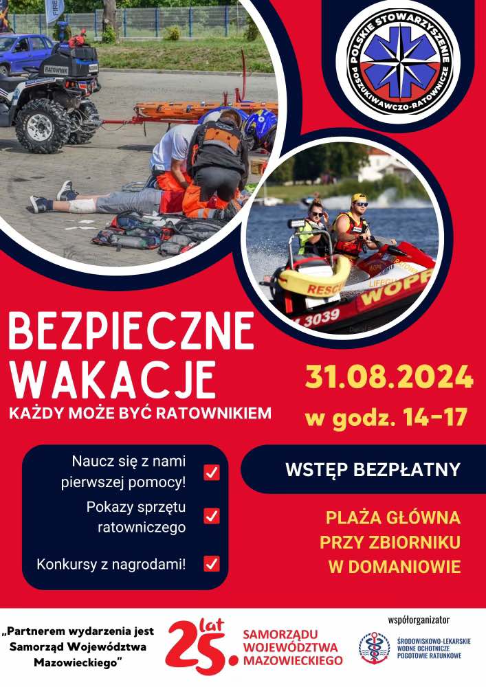 Polskie Stowarzyszenie poszukiwawczo-ratownicze, Środowiskowo-Lekarskie Wodne Ochotnicze Pogotowie Ratunkowe wraz z Samorządem Województwa Mazowieckiego zapraszają do udziału w projekcie "Bezpieczne Mazowsze – Każdy Może Być Ratownikiem”. Wspomniane wydarzenie to inicjatywa mająca na celu podniesienie świadomości społecznej na temat pierwszej pomocy oraz promocję marki Mazowsze i Województwa Mazowieckiego. Spotkanie, które odbędzie się przy zbiorniku wodnym Domaniów już 31 sierpnia, obejmuje szkolenia z zakresu pierwszej pomocy, gry i zabawy edukacyjne, a także konkursy z nagrodami. Szczegóły wydarzenia na plakacie.