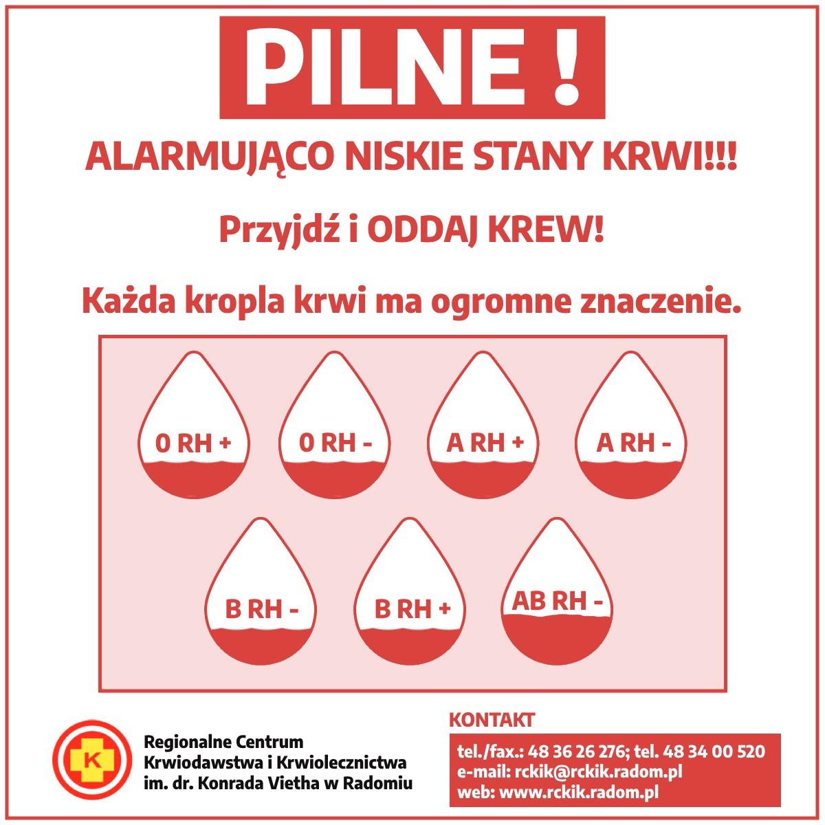 Regionalne Centrum Krwiodawstwa i Krwiolecznictwa im. dr Konrada Vietha w Radomiu zwraca się z gorącą prośbą o wsparcie. Jednostka ta boryka się z dramatycznie niskimi stanami krwi, które zagrażają zdrowiu i życiu pacjentów szpitali. Przez braki, RCKiK, nie jest w stanie realizować zapotrzebowania zgłaszanego przez szpitale. Niestety, oznacza to, że ratujące życie operacje muszą być przekładane.
