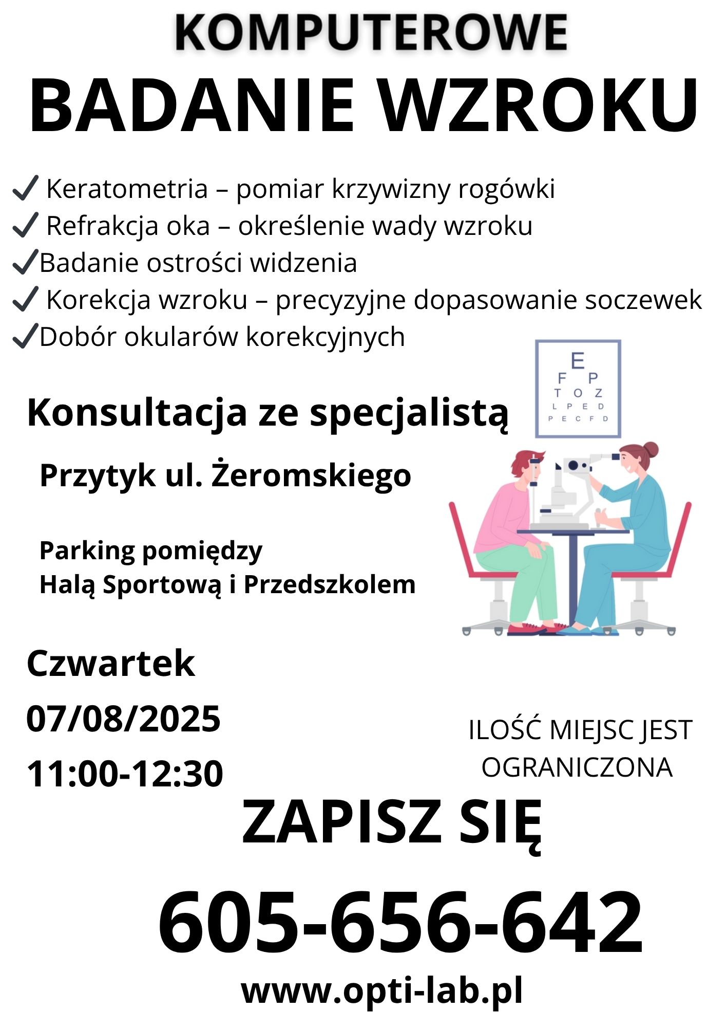 Zapraszamy mieszkańców gminy Przytyk na bezpłatne badania wzroku, które odbędą się w środę, 7 sierpnia 2025 r., w godz. 11:00–12:30.