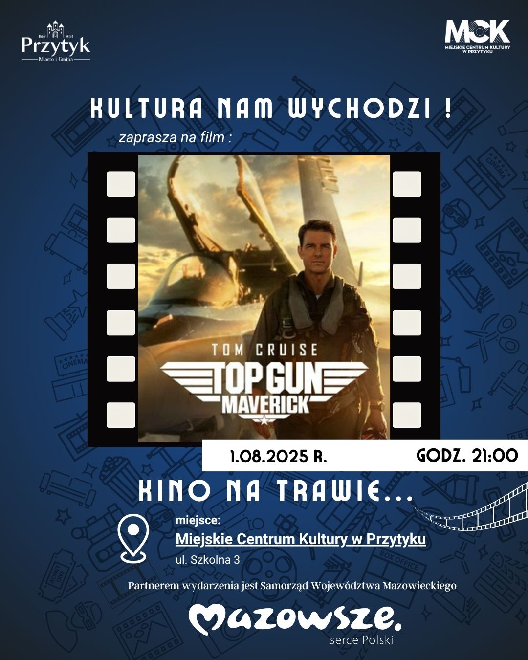 Gmina Przytyk oraz Miejskie Centrum Kultury serdecznie zapraszają na kolejny seans z cyklu Kino na Trawie. Już w najbliższy piątek, 2 sierpnia o godzinie 21:00, na terenie MCK przy ul. Szkolnej 3 w Przytyku, zaprezentujemy film „Top Gun: Maverick” – dynamiczne kino akcji z Tomem Cruise"em w roli głównej.