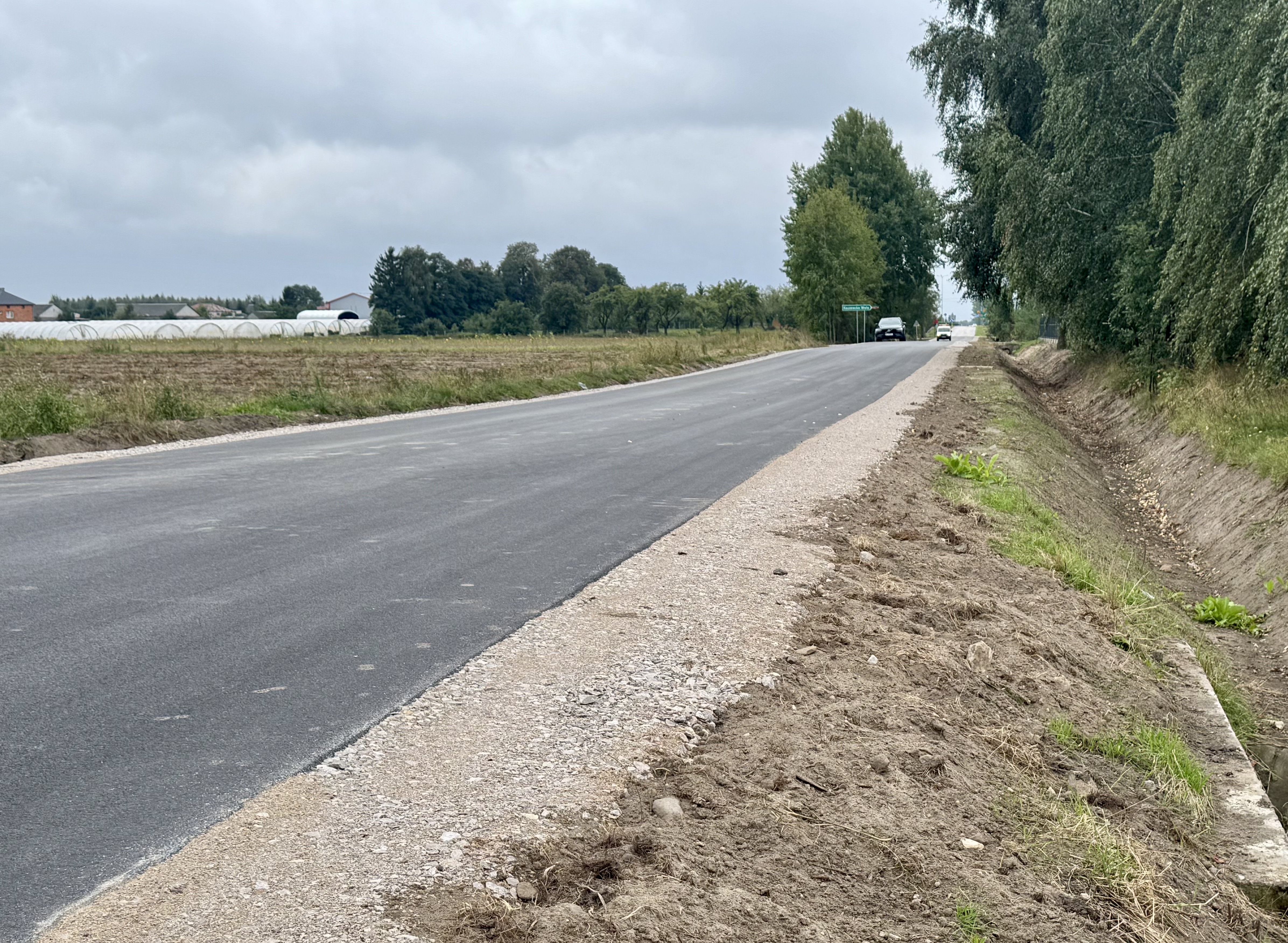 Zakres prac objął frezowanie istniejącej nawierzchni, ułożenie warstwy wyrównawczej i ścieralnej z betonu asfaltowego, wzmocnienie poboczy materiałem kamiennym, a także oczyszczenie rowu i przepustu oraz wykonanie oznakowania. Dzięki temu droga zyskała nową, trwałą nawierzchnię i poprawione parametry techniczne, co bezpośrednio przekłada się na bezpieczeństwo i komfort jazdy mieszkańców.