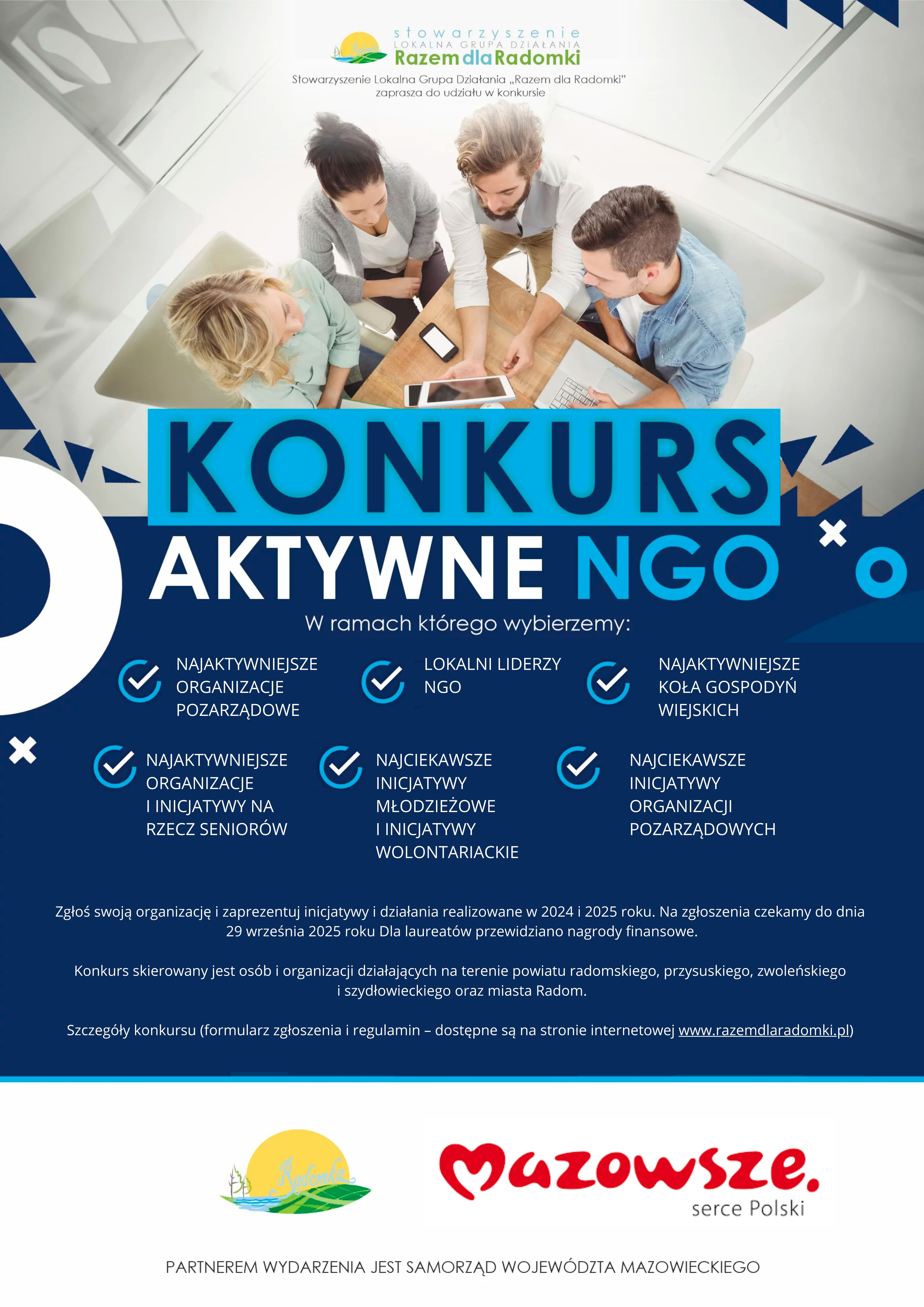 Stowarzyszenie „Razem dla Radomki” serdecznie zaprasza do udziału w szóstej edycji konkursu „Aktywne NGO”. To wyjątkowa inicjatywa, której celem jest wyróżnienie najprężniej działających organizacji pozarządowych, kół gospodyń wiejskich liderów społecznych oraz wolontariuszy, którzy swoimi działaniami przyczyniają się do rozwoju lokalnych społeczności. Konkurs obejmuje organizacje i inicjatywy z powiatów radomskiego, przysuskiego, zwoleńskiego i szydłowieckiego, a także ma na celu promowanie innowacyjnych projektów oraz inspirujących przykładów współpracy obywatelskiej.