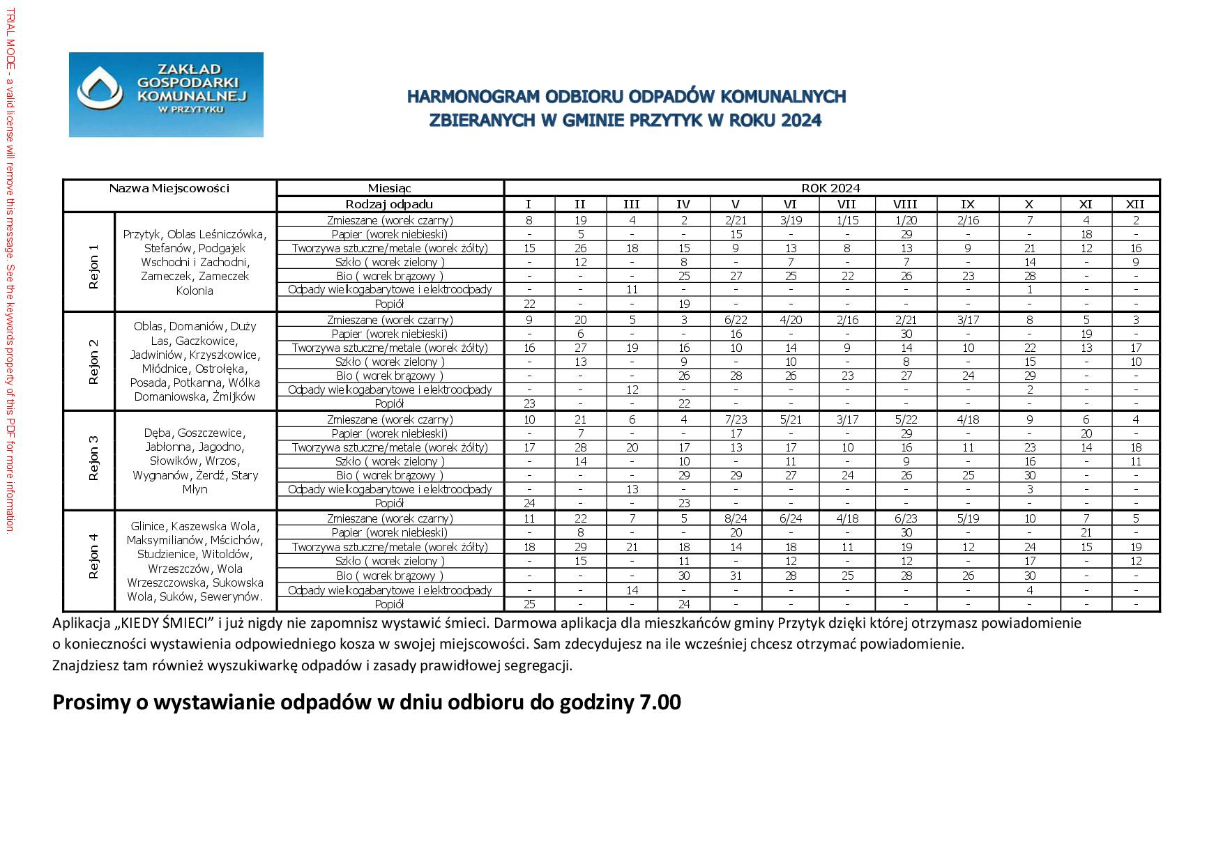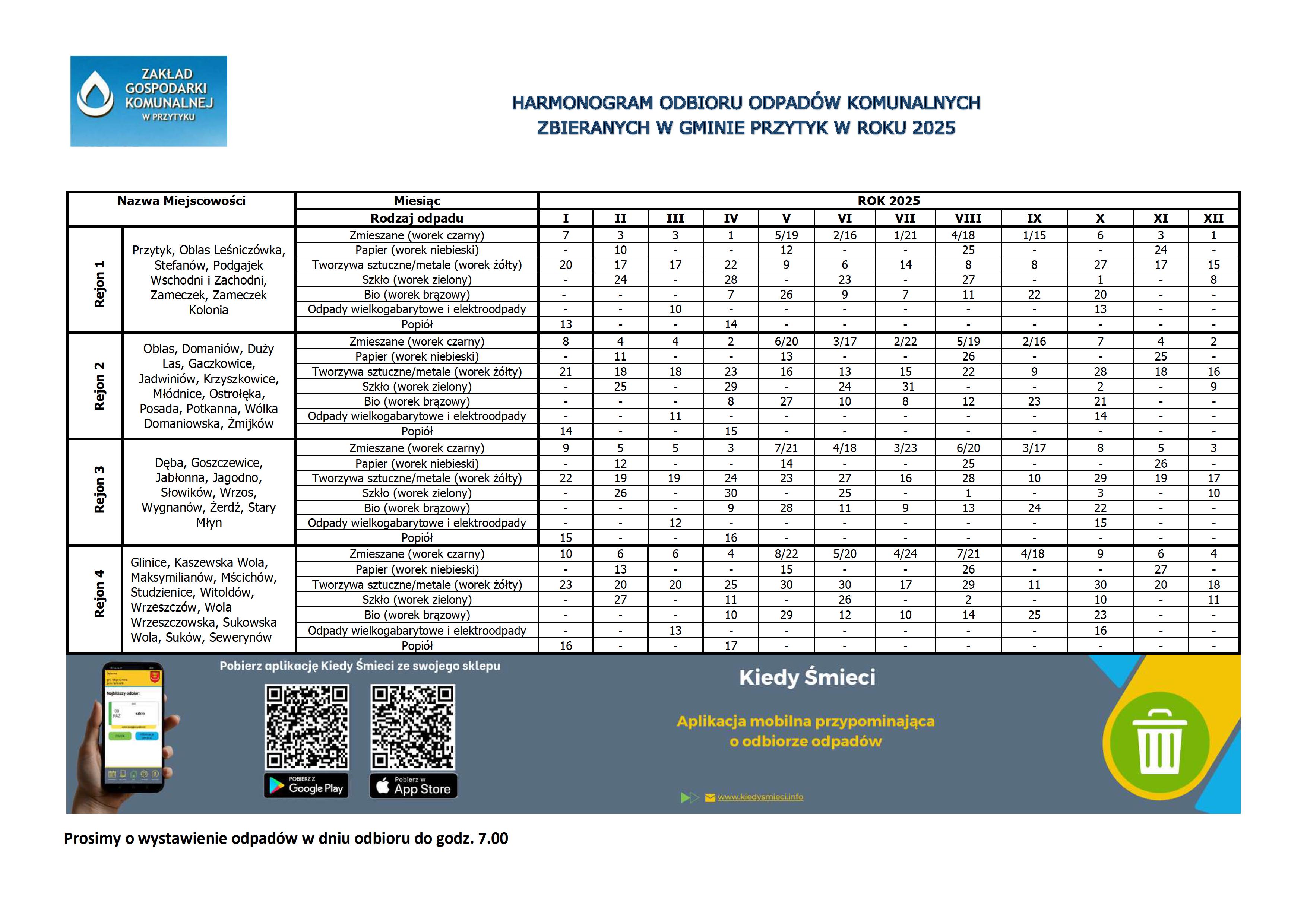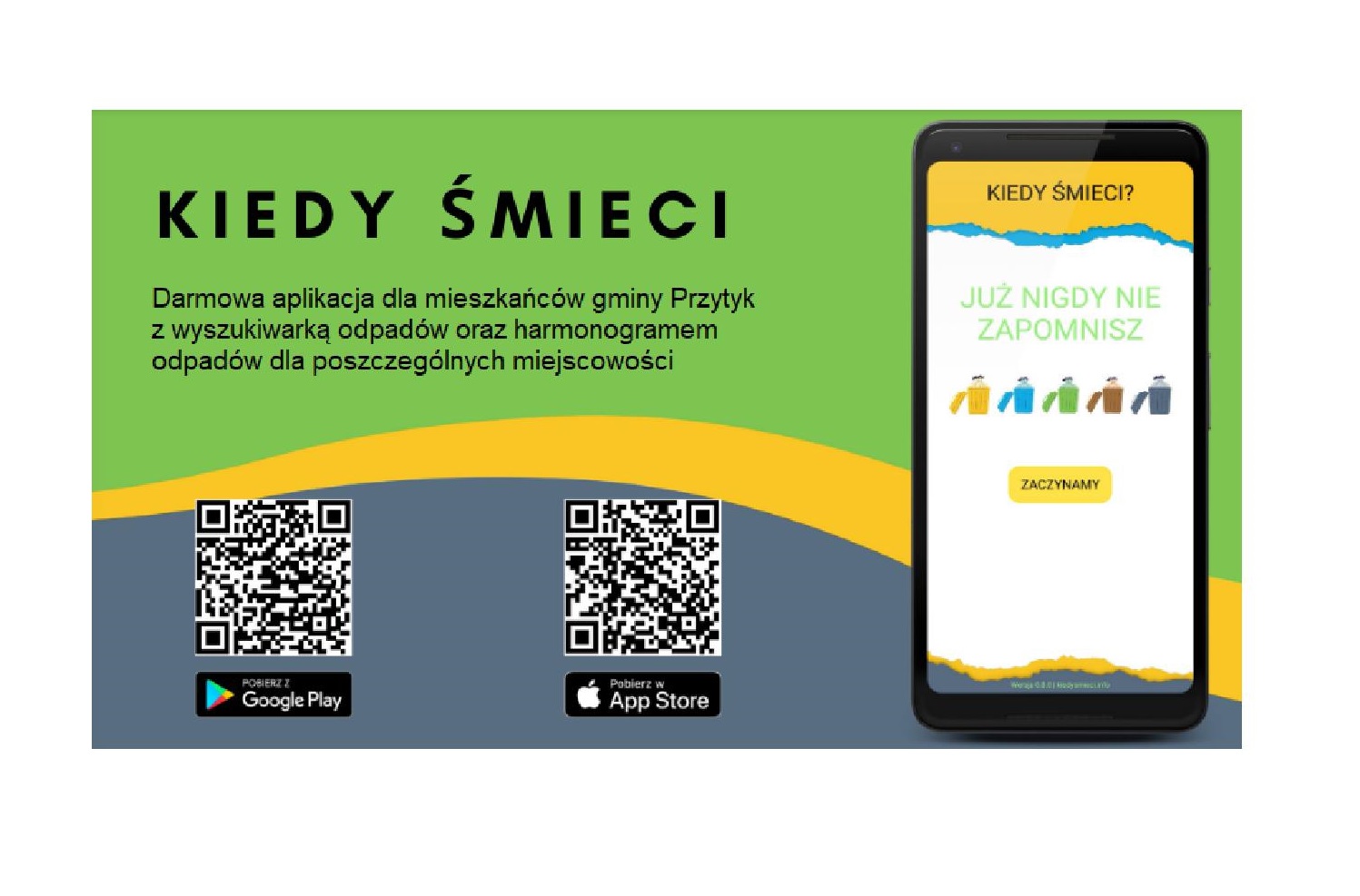 Jeśli nie wiecie, co wrzucać do poszczególnych pojemników oznaczonych kolorami, z pomocą przychodzi aplikacja mobilna „Kiedy Śmieci”. Znajdziemy tu wyszukiwarkę odpadów, która podpowie nam do jakiego worka wrzucić dany odpad jak również harmonogram odbioru odpadów komunalnych z miejscowości na terenie gminy Przytyk. Aplikacja „Kiedy Śmieci” ułatwi nam przygotowywanie odpowiednich worków na wybrane dni.