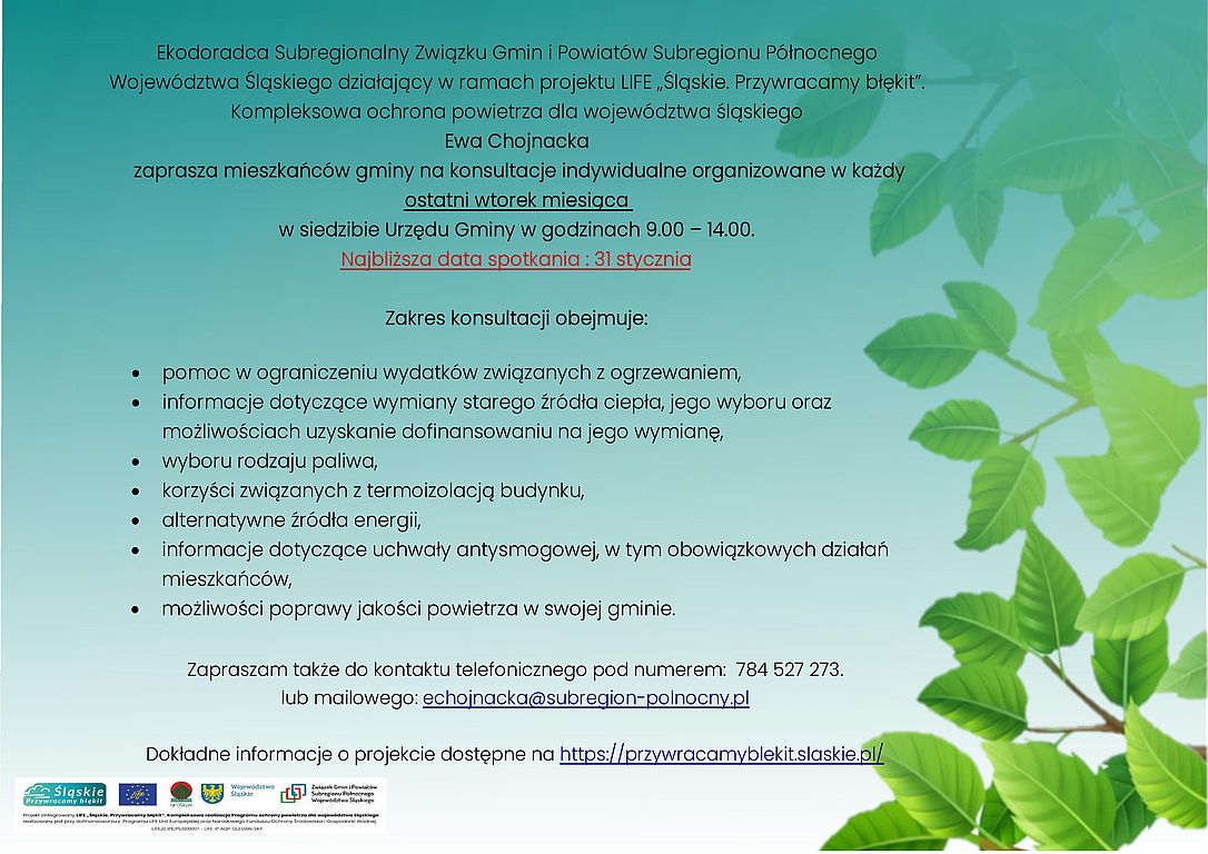 Zapraszamy na spotkanie z Ekodoradcą Subregionalnym Związku Gmin i Powiatów Subregionu Północnego Województwa Śląskiego we wtorek 31 stycznia 2023 godzina 9.00-14.00 - Urząd Gminy Wręczyca Wielka