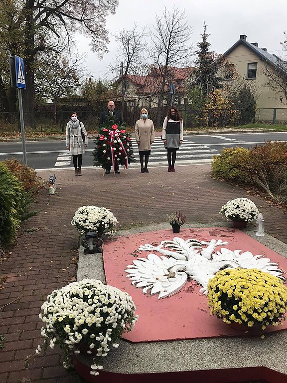 Wójt Gminy Wręczyca Wielka Tomasz Osiński, Sekretarz Gminy Magdalena Kasprzak oraz przedstawicielki Szkoły Podstawowej im. Adama Mickiewicza we Wręczycy Wielkiej Wicedyrektor Justyna Soluch oraz Jolanta Kot złożyli kwiaty w miejscu pamięci walczących za Ojczyznę oraz oddali hołd polskim bohaterom w 102. rocznicę odzyskania przez Polskę niepodległości.