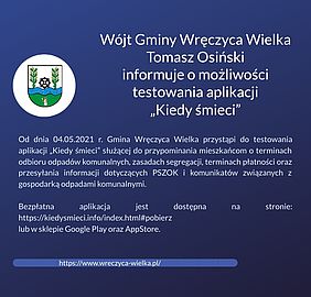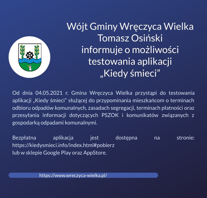 Od dnia 04.05.2021 r. Gmina Wręczyca Wielka przystąpi do testowania aplikacji „Kiedy śmieci” służącej do przypominania mieszkańcom o terminach odbioru odpadów komunalnych, zasadach segregacji, terminach płatności oraz przesyłania informacji dotyczących PSZOK i komunikatów związanych z gospodarką odpadami komunalnymi.