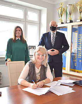 W oficjalnym przekazaniu placu budowy udział wzięli: Wójt Gminy Wręczyca Wielka Tomasz Osiński, Dyrektor Szkoły Podstawowej im. Stanisława Ligonia w Truskolasach, Radna Powiatu Kłobuckiego Justyna Strzelczyk, Radne Gminy Wręczyca Wielka Małgorzata Zatyka oraz Urszula Zomerfeld, Z-ca Dyrektor Szkoły Podstawowej im. Stanisława Ligonia w Truskolasach Małgorzata Olszewska, Inspektor ds zamówień publicznych i Inwestycji w Referacie Inwestycji, Gospodarki Przestrzennej i Gospodarki Nieruchomościami Kornelia Kowalska, Inspektor Nadzoru Mirosław Topolski, kierownik budowy Roman Kik.