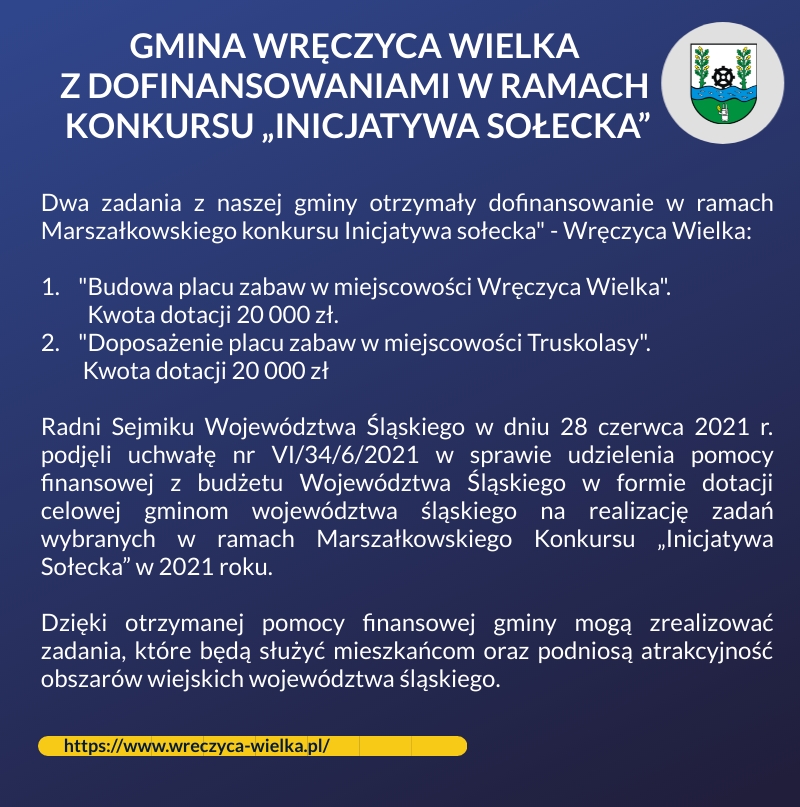 Radni Sejmiku Województwa Śląskiego w dniu 28 czerwca 2021 r. podjęli uchwałę nr VI/34/6/2021 w sprawie udzielenia pomocy finansowej z budżetu Województwa Śląskiego w formie dotacji celowej gminom województwa śląskiego na realizację zadań wybranych w ramach Marszałkowskiego Konkursu „Inicjatywa Sołecka” w 2021 roku.