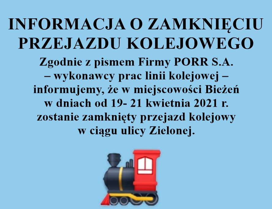 Zgodnie z pismem Firmy PORR S.A. – wykonawcy prac linii kolejowej – informujemy, że w miejscowości Bieżeń w dniach od 19- 21 kwietnia 2021 zostanie zamknięty przejazd kolejowy w ciągu ulicy Zielonej.