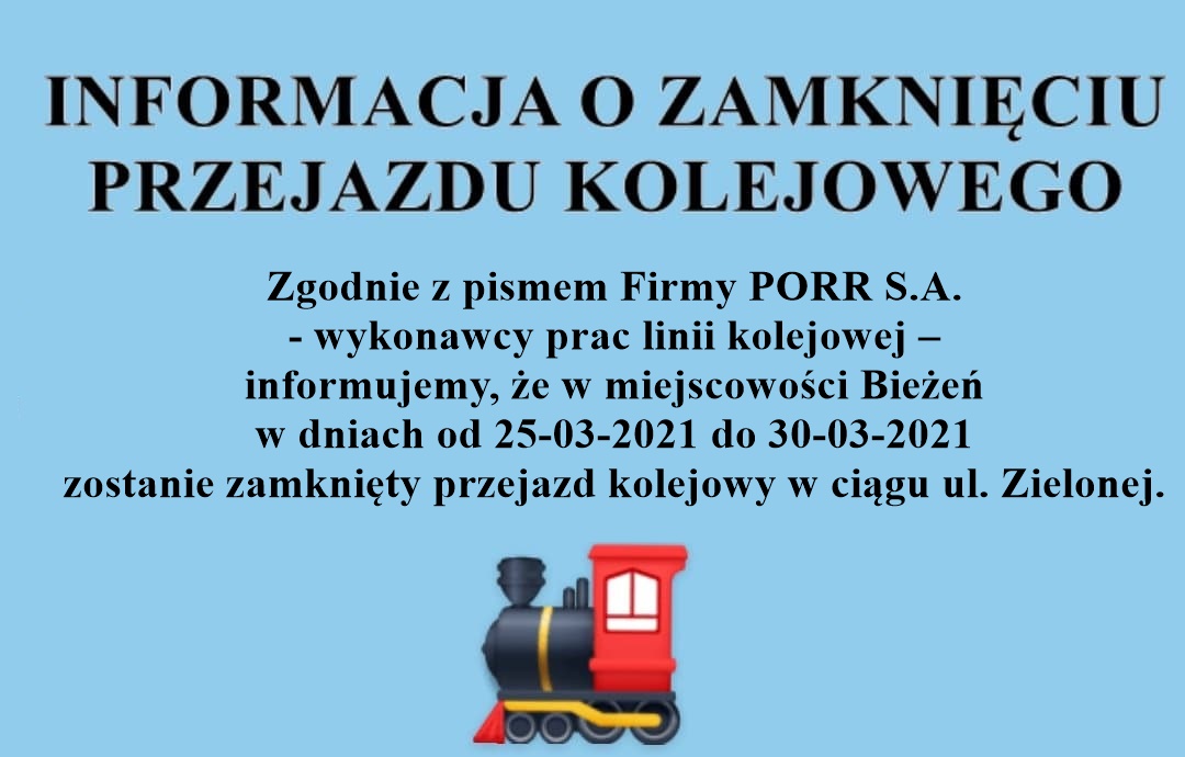 Zgodnie z pismem Firmy PORR S.A. - wykonawcy prac linii kolejowej – informujemy, że w miejscowości Bieżeń w dniach od 25-03-2021 do 30-03-2021 zostanie zamknięty przejazd kolejowy w ciągu ul. Zielonej.