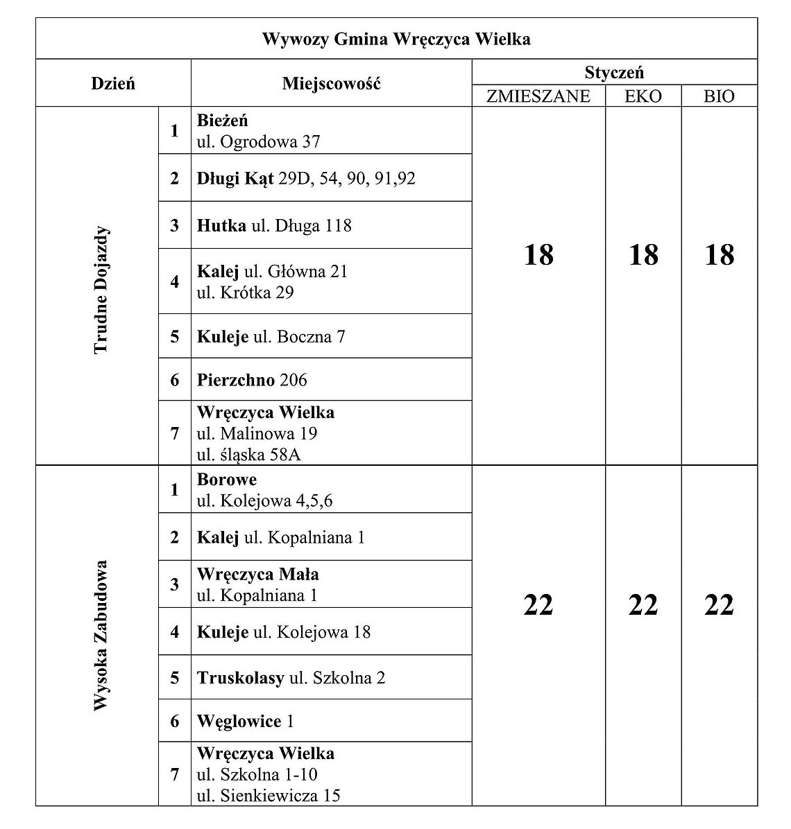 W celu zapewnienia w miesiącu styczniu 2021 r. płynności odbioru i zagospodarowania odpadów komunalnych od właścicieli nieruchomości zamieszkałych oraz nieruchomości, na której znajduje się domek letniskowy i innej nieruchomości wykorzystywanej na cele rekreacyjno-wypoczynkowe położonych na terenie Gminy Wręczyca Wielka, odbiór w/w odpadów będzie realizowany przez dotychczasowego Wykonawcę - firmę EKO–SYSTEM BIS Sp. z o. o SK z siedzibą w Konopiskach. Poniżej przedstawiamy terminy odbioru odpadów dla wysokiej zabudowy i trudnych dojazdów.