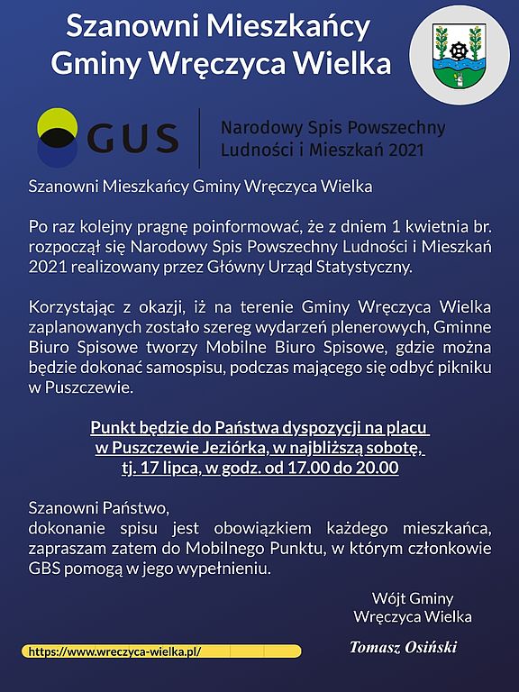 Korzystając z okazji, iż na terenie Gminy Wręczyca Wielka zaplanowanych zostało szereg wydarzeń plenerowych, Gminne Biuro Spisowe tworzy Mobilne Biuro Spisowe, gdzie można będzie dokonać samospisu, podczas mającego się odbyć pikniku w Puszczewie.