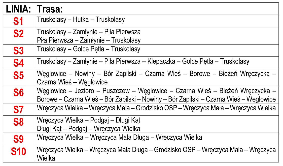 Aby umożliwić uczniom Piły Pierwszej dojazd do szkół średnich w Częstochowie i Kłobucku uruchamia się w dni nauki szkolnej kurs o g. 6.40 linia S2 Piła Pierwsza – Zamłynie – Truskolasy Rynek przyjazd g. 6.47. W Truskolasach Rynek możliwość przesiadki na autobusy GTVBUS do Częstochowy o g. 6.50 lub 6.55 oraz do Kłobucka Zagórze odjazd z Truskolas o g. 7.04.