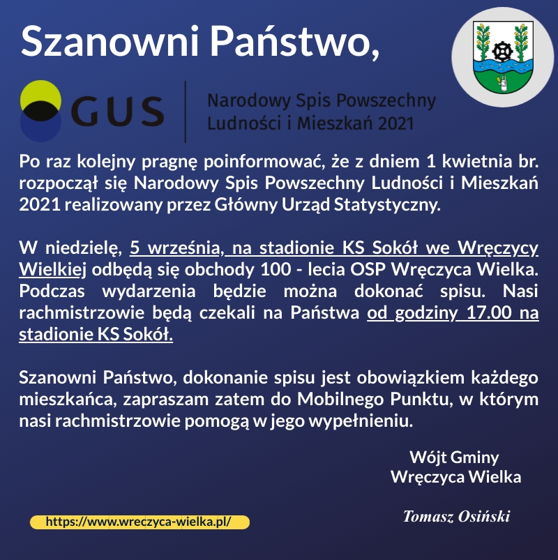 Po raz kolejny pragnę poinformować, że z dniem 1 kwietnia br. rozpoczął się Narodowy Spis Powszechny Ludności i Mieszkań 2021 realizowany przez Główny Urząd Statystyczny. W niedzielę, 5 września, na stadionie KS Sokół we Wręczycy Wielkiej odbędą się obchody 100 - lecia OSP Wręczyca Wielka.