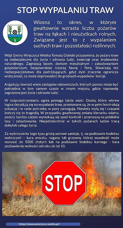 Wójt Gminy Wręczyca Wielka Tomasz Osiński przypomina, że pożary traw są niebezpieczne dla życia i zdrowia ludzi, zwierząt oraz środowiska naturalnego. Zagrażają lasom, domom mieszkalnym i zabudowaniom gospodarczym, bezpowrotnie niszczą faunę i florę. Stwarzają też niebezpieczeństwo dla podróżujących, gdyż dym znacznie ogranicza widoczność, co może doprowadzić do groźnych wypadków i kolizji. Angażują również wiele zastępów ratowniczych, których pomoc może być potrzebna w tym samym czasie w innym miejscu, gdzie naprawdę zagrożone jest życie i zdrowie ludzi.