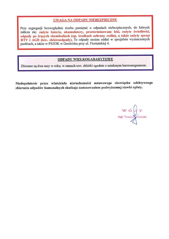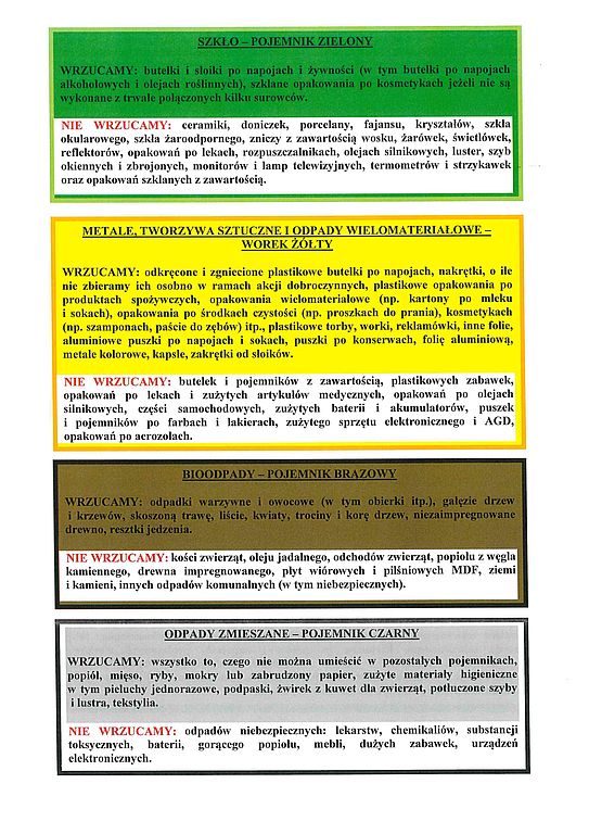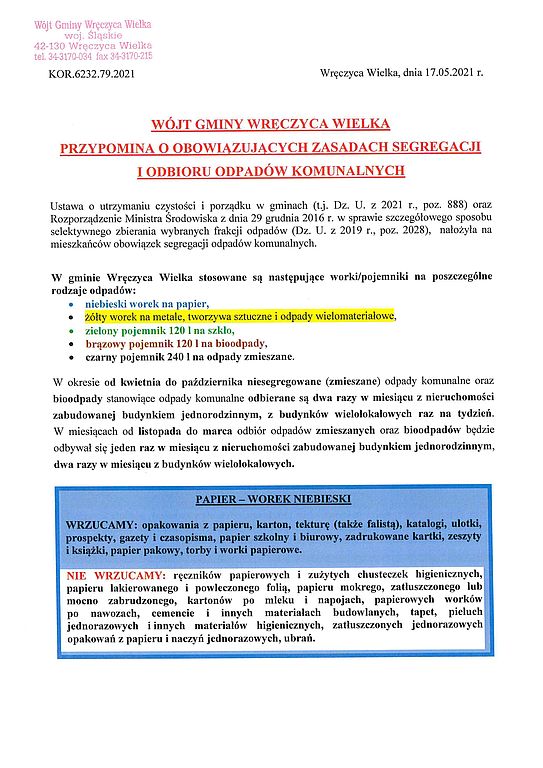 WÓJT GMINY WRĘCZYCA WIELKA PRZYPOMINA O OBOWIĄZUJĄCYCH ZASADACH SEGREGACJI I ODBIORU ODPADÓW KOMUNALNYCH