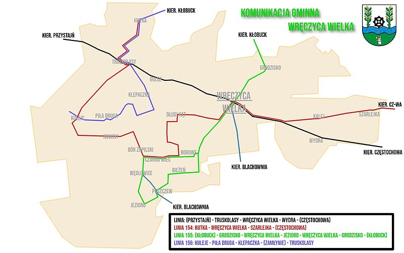 I tak jadąc od Kłobucka przez Grodzisko – Wręczycę Małą – Wręczycę Wielką dalej przez Borowe PKP – Borowe Sportowa – Bieżeń Strażacka – Bieżeń Szkolna – Bieżeń Ogrodowa – Puszczew I – Jezioro pojedzie dalej przez Węglowice – Czarną Wieś – Bieżeń Wręczycką – Borowe PKP i dalej w kierunku Wręczyca Wielka – Wręczyca Mała – Grodzisko – Kłobuck. Linia okrężna będzie funkcjonowała na przemian w dwóch wariantach. - Nowy układ linii 155 umożliwi mieszkańcom Bieżenia możliwość bezpłatnego dotarcia komunikacją gminną do Węglowic i Czarnej Wsi. Mieszkańcy Węglowic, Czarnej Wsi, Bieżenia Wręczycka otrzymają możliwość bezpośredniego połączenia z Kłobuckiem oraz zyskają dodatkowe połączenia z Wręczycą.