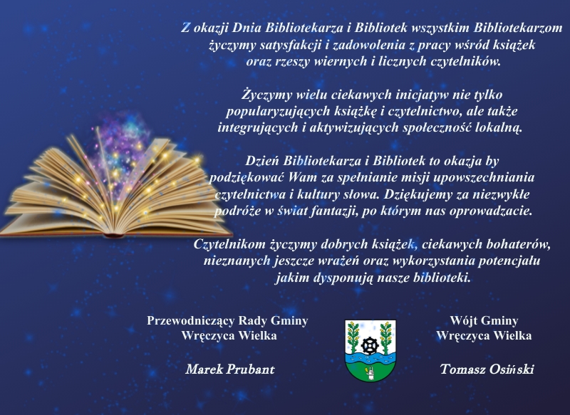 Z okazji Dnia Bibliotekarza i Bibliotek wszystkim Bibliotekarzom życzymy satysfakcji i zadowolenia z pracy wśród książek oraz rzeszy wiernych i licznych czytelników.