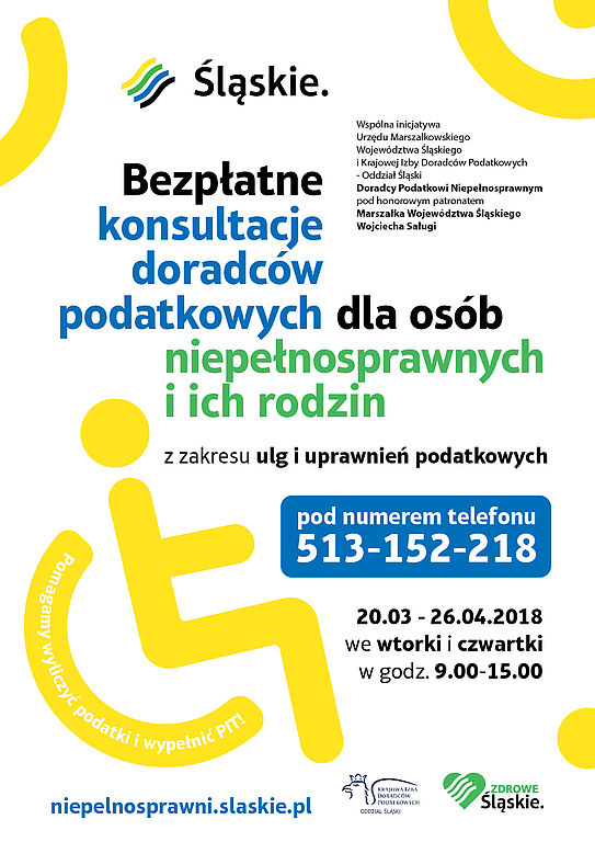 Od wtorku 20 marca br. do 26 kwietnia we wtorki i czwartki w godzinach od 9.00 do 15.00 Doradcy Podatkowi ze Śląskiego Oddziału Krajowej Izby Doradców Podatkowych będą prowadzili bezpłatne konsultacje z zakresu ulg i uprawnień podatkowych przysługujących osobom niepełnosprawnym i ich rodzinom.