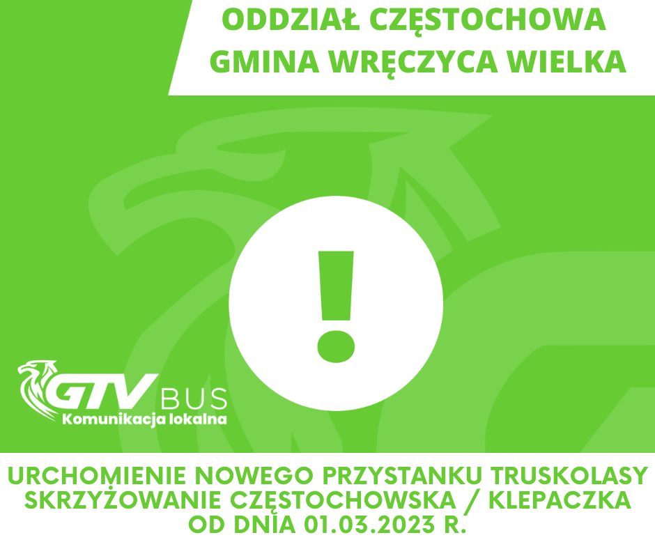 Na wniosek Urzędu Gminy we Wręczycy Wielkiej z dniem 01 marca 2023 roku (środa) zostanie uruchomiony nowy, dodatkowy przystanek dla linii gminnych 157 i 158 o nazwie TRUSKOLASY SKRZYŻOWANIE CZĘSTOCHOWSKA / KLEPACZKA.