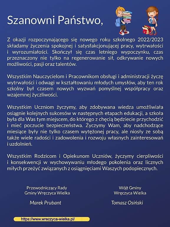 Z okazji rozpoczynającego się nowego roku szkolnego 2022/2023 składamy życzenia spokojnej i satysfakcjonującej pracy, wytrwałości i wyrozumiałości. Skończył się czas letniego wypoczynku, czas przeznaczony nie tylko na regenerowanie sił, odkrywanie nowych możliwości, pasji oraz talentów.
