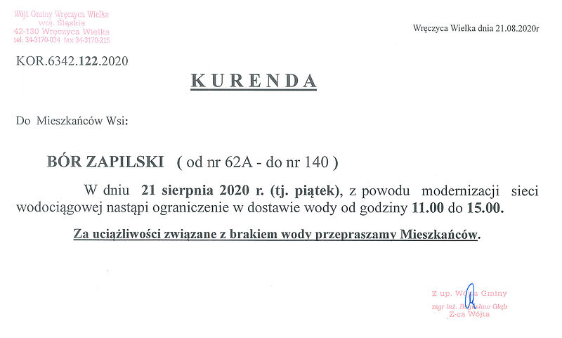 Ograniczenie w dostawie wody w miejscowości Bór Zapilski