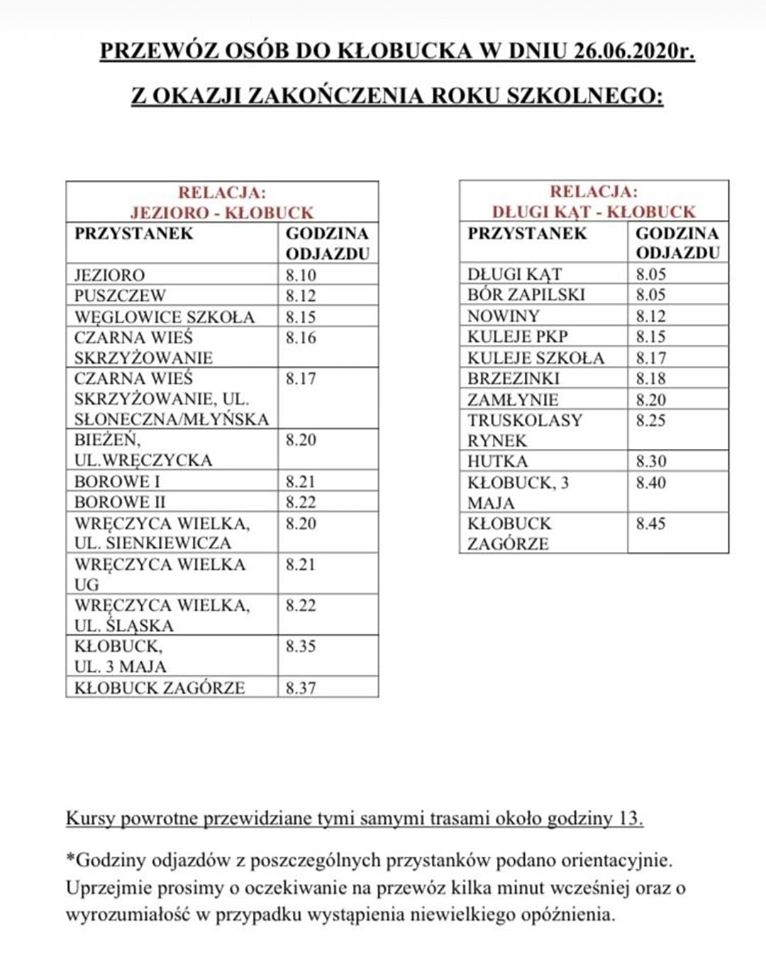 Informacja na temat przewozów dla uczniów w związku z zakończeniem roku szkolnego