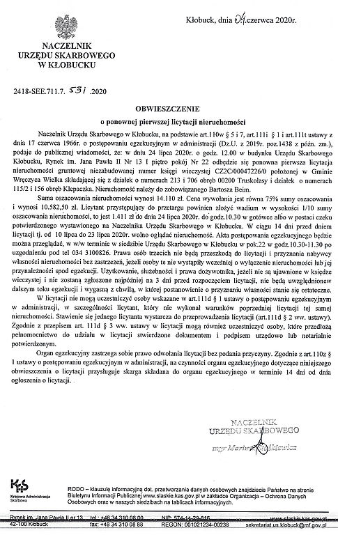 Obwieszczenie o ponownej pierwszej licytacji nieruchomości