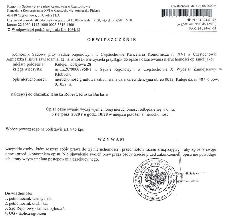 Obwieszczenie Komornika Sądowego o przystąpieniu do opisu i szacowania nieruchomości w miejscowości Kuleje