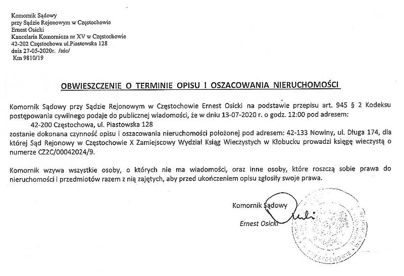 Obwieszczenie o terminie opisu i oszacowania nieruchomości: Nowiny