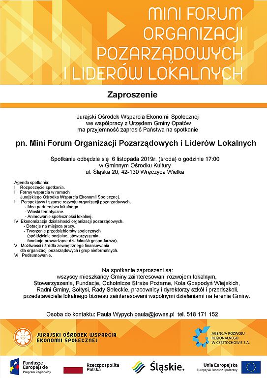 Spotkanie ma na celu przedstawienie idei przedsiębiorczości społecznej, animacji lokalnej i zachęcenie liderów do czynnego działania na rzecz rozwoju Gminy i miejscowości w których żyją. Pragniemy przedstawić uczestnikom ofertę wsparcia Jurajskiego Ośrodka Wsparcia Ekonomii Społecznej oraz możliwość dofinansowania miejsc pracy w ich organizacjach.