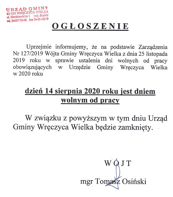 W dniu 14.08.2002 r. Urząd Gminy Wręczyca Wielka będzie zamknięty